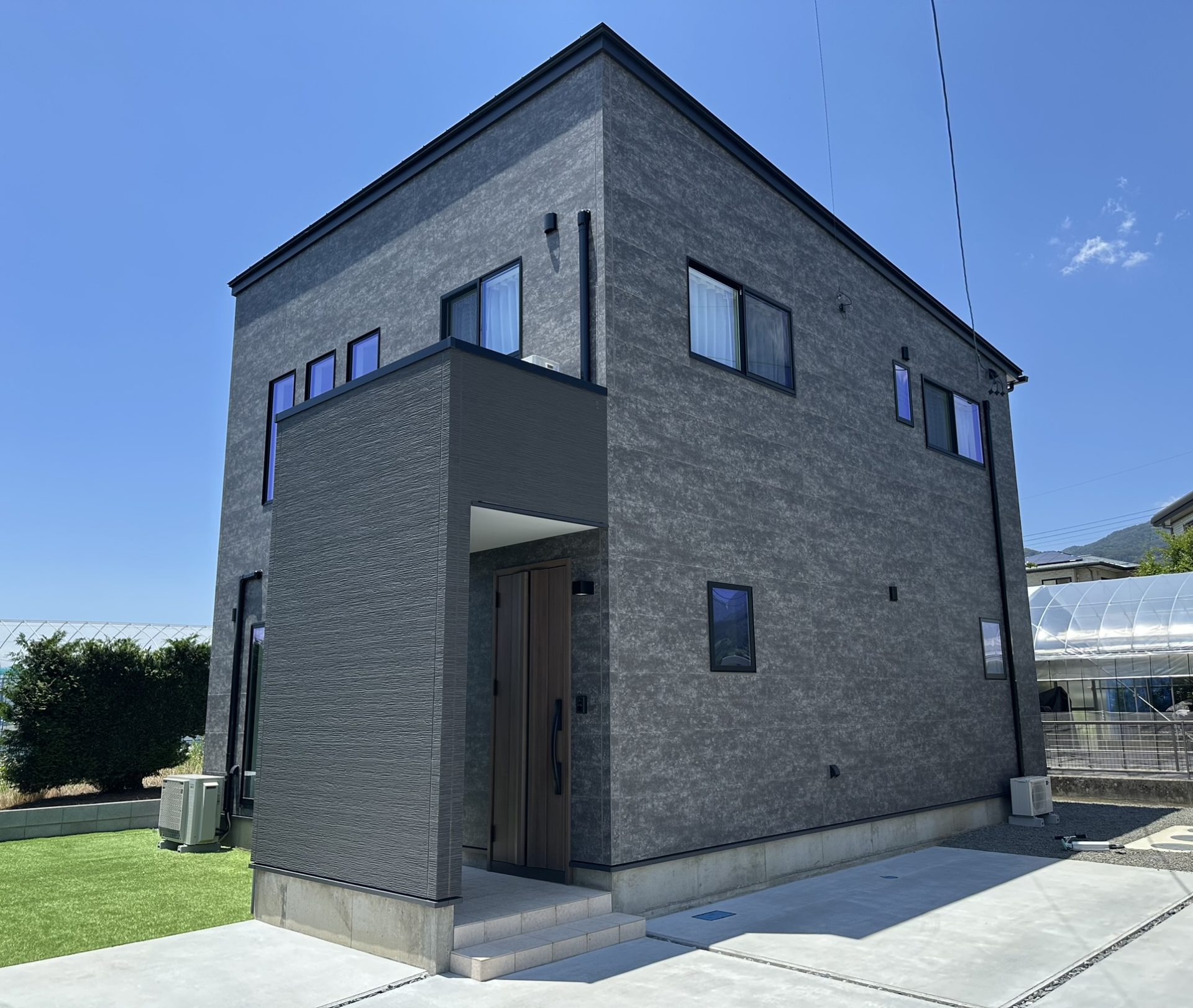 外観は、人気のKmew窯業系サイディング「FLAT DESIGN PANEL フィエルテ・チタンアイロン」をベースに、重厚感のあるブラックで統一。