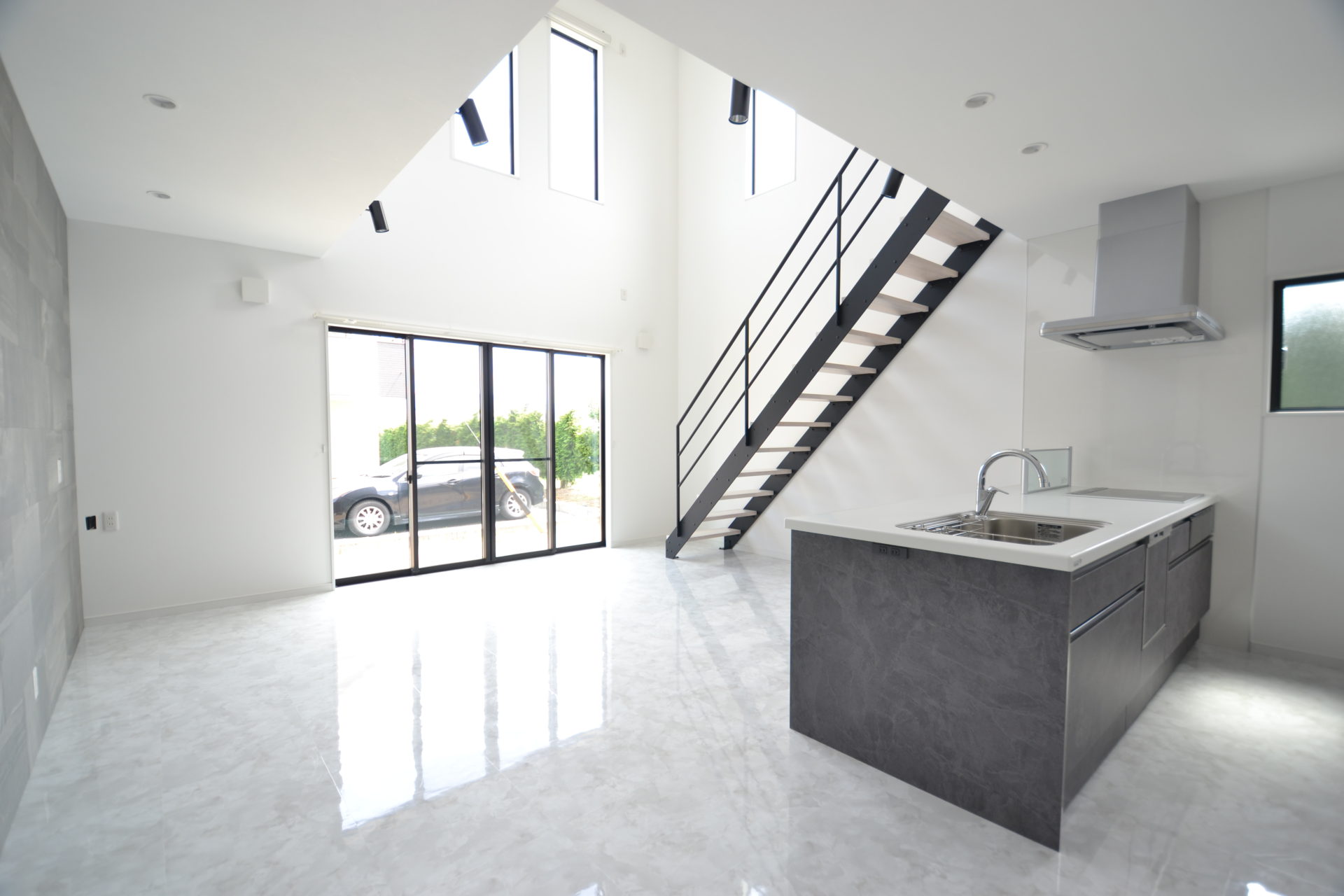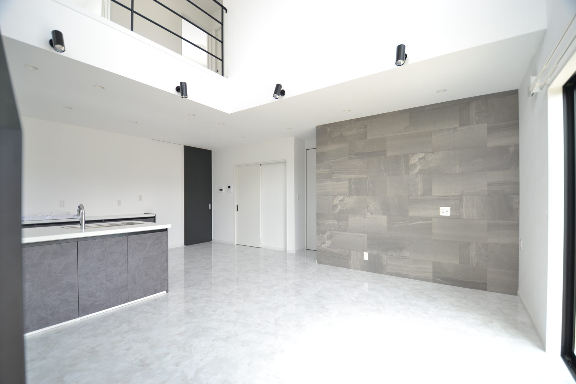 内装は、SINCOLフロアタイル「アラベスカート MS-2083(ストーン柄・ホワイト)」を基調とし、スチール階段やアクセントウォール、キッチンなどをモノトーンでまとめ、洗練された印象を演出しています。